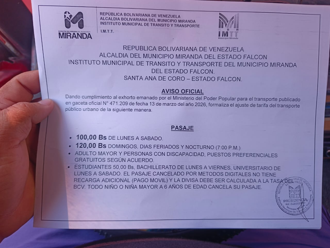 Coro, estado Falcón – En cumplimiento con las directrices emanadas por el Ejecutivo Nacional, a través del Ministerio del Poder Popular para el Transporte, el Instituto Municipal de Tránsito y Transporte (IMTT) de la alcaldía de Miranda, formalizó el nuevo esquema tarifario para el servicio de transporte público urbano en la jurisdicción.