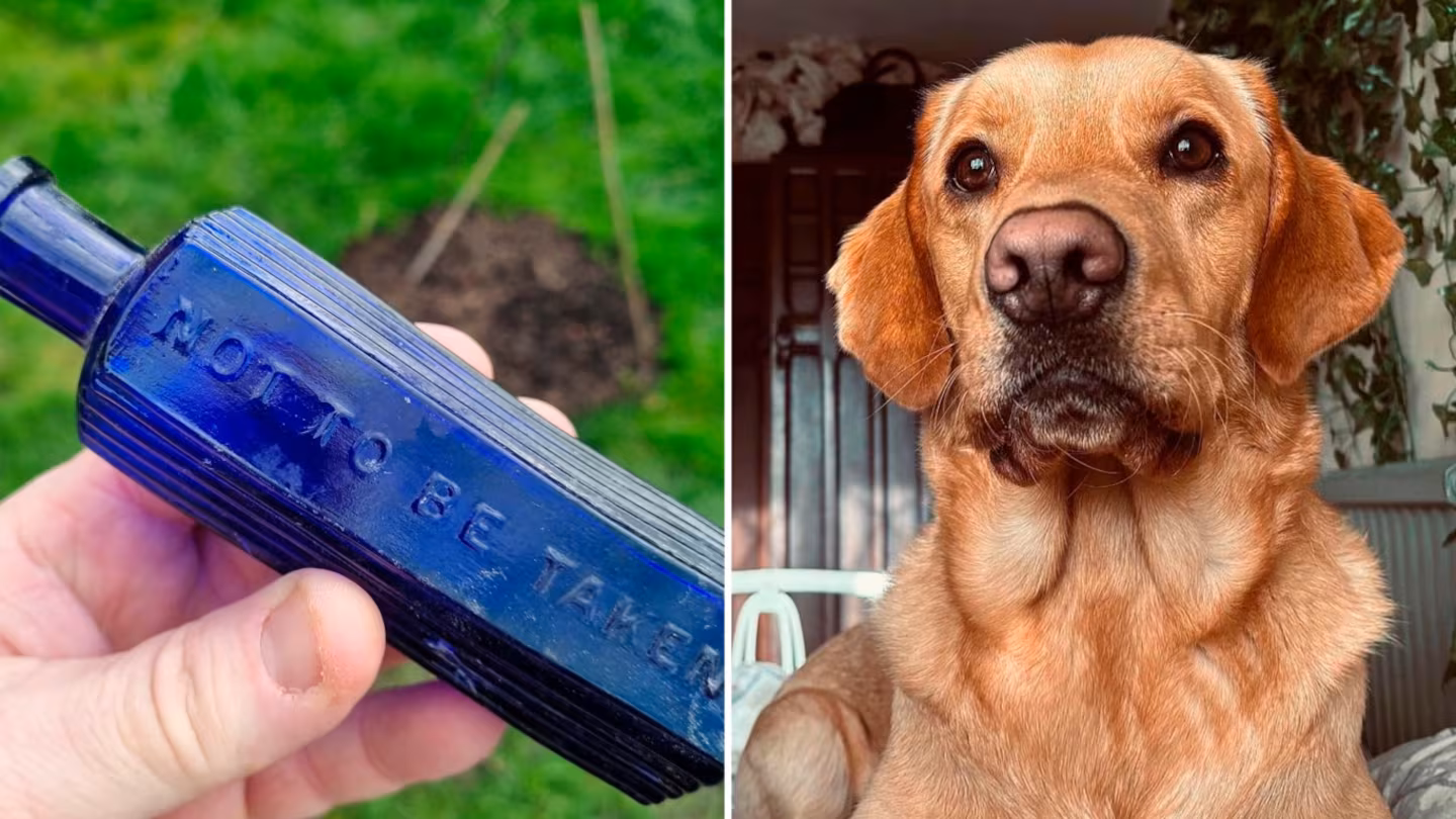 Su dueño, Paul Phillips, de 49 años, contó que, a pesar de tapar los pozos, el perro volvía una y otra vez al lugar. Hasta que un día, entre la tierra removida, apareció una botella de vidrio azul con la inscripción “No ingerir” grabada en un costado.