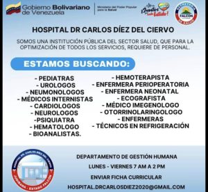 Judibana, estado Falcón – Con el objetivo de optimizar la prestación de servicios de salud y fortalecer la atención pública en la región, la directiva del Hospital Dr. Carlos Diez del Ciervo ha iniciado un proceso de captación de talento humano para diversas áreas asistenciales y técnicas.