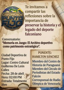Punto Fijo, estado Falcón – Con la misión de resaltar la importancia de los archivos documentales como pilares esenciales de la identidad regional, el Complejo Deportivo Recreacional “Ciudad de Punto Fijo” y el Centro de Historia de Paraguaná invitan a participar en el conversatorio titulado «Memoria en Juego: El Archivo deportivo como patrimonio estratégico».